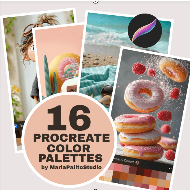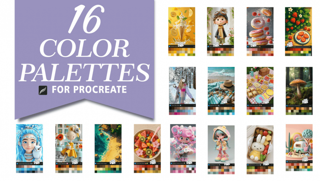 I collected a series of inspiring images from Pinterest and transformed them into 16 fun, creative, beginner-friendly color palettes—perfect for your next Procreate project! From soft, cute combos to bright summer vibes and cozy winter tones, there’s a little magic for every mood. These palettes take the guesswork out of color mixing so you can dive straight into creating beautiful illustrations with confidence and ease.