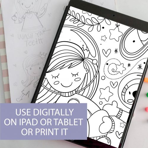 This is a 16 Sheet Digital coloring book for you to use with your iPad, tablet or as a Digital Coloring book or to Print and color with traditional media like crayons, markers, and more. Enjoy some relaxing time coloring these cute pages full of cute space adventures and little creatures.